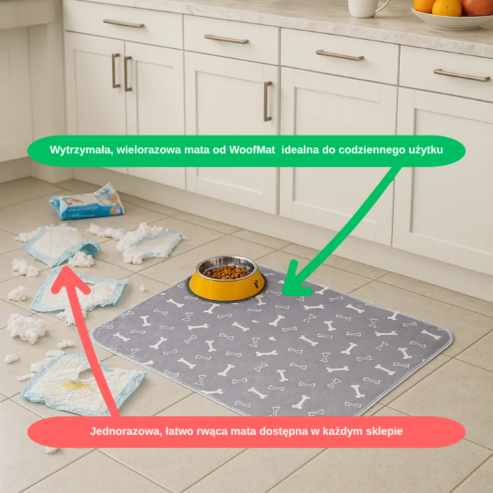 Jednorazowe podkłady działają tylko raz. Nawet jeśli pies ich nie użyje, lądują w koszu. To powtarzający się, comiesięczny wydatek sięgający średnio 253–366 zł. Kupujesz, masz nadzieję, nie działa, kupujesz ponownie i w ten sposób branża jednorazówek zarabia miliardy, podczas gdy portfel opiekuna pustoszeje.
